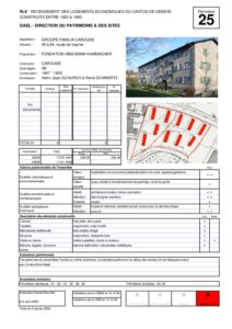 Immeuble construit en 1950 et en 2018. Ensemble construit en 1947-1950 par Henri-Jean Schurch et René Schwertz. Propriété de la fondation HBM Emma Kammacher. Démoli dans les années 2010 pour faire place à un nouveau projet, noté « »A » » Exceptionnel dans la notice sur l’habitat économique. Construit dans les années 50 sur un standard des années 1920, dépassé. ===Années 2010=== Nouveau projet, construit en deux étapes, en 2012-2018 (autorisation en 2011, concours en 2008). 330 appartements construits à la place de 120 précédemment. Phasage des travaux intéressant (d’abord construction d’une partie des nouveaux immeubles, déménagement des locataires des anciens immeubles dans les nouveaux, puis démolission des anciens, et consruction de la deuxième étape. Au total 7 tours rectangles de 19 mètres x 24.50. <ref>L’édifice est cité dans « L’architecture à Genève XXIe siècle », éditions Infolio, page 75.</ref> <REF>Fait partie du Recensement des Logements Economiques du Canton de Genève construits entre 1920 et 1960</REF>:File:dps_25.pdf