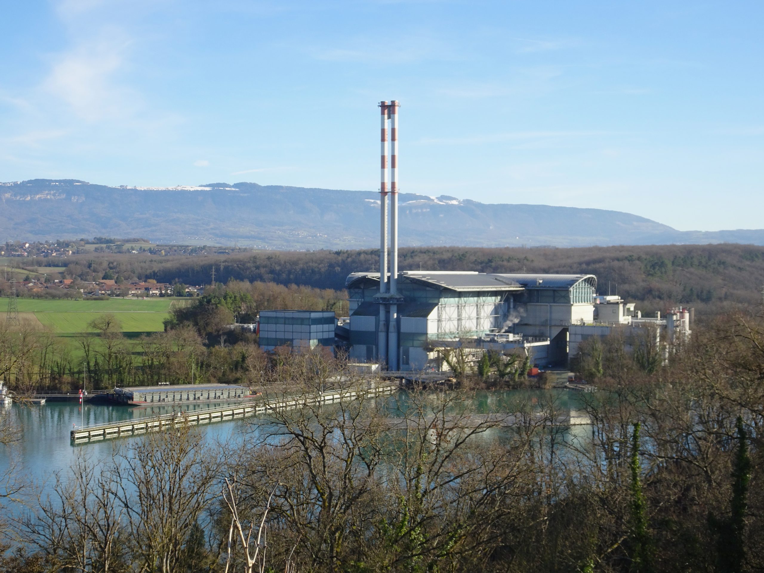 Incinérateur des ordures de Genève. La chminée, à 104m, est le point construit par l’homme le plus haut du canton, 6 mètres plus haut que la plus haute tour du lignon (au moins en 2018…). Centrale hydro-électrique et barrage, projets et réalisations 1936-1943 par Zschokke (architectes : Edmond Guex et Gardhard Kirchhoff). Usine par Maurice et Pierre Braillard. <ref>mentionné dans le Guide artistique de la Suisse, Tome 4a, établi par la Société d’histoire de l’art en Suisse, page 903</ref><ref>Cité dans « L’architecture à Genève 1919-1975 », volume 2, édité par Infolio, page 484</ref> Extension en 1990-1993 par le bureau ASS (Michael Annen, Hans Siegle, Rolf Siebold, Walter Stämpfli, Sully-Paul Vuille, Christine Delarue, Gaëtan Gaumont.<ref>Cité dans « L’architecture à Genève 1976-2000 », édité par Infolio, page 258Category:Architecture à Genève 1976-2000</ref>