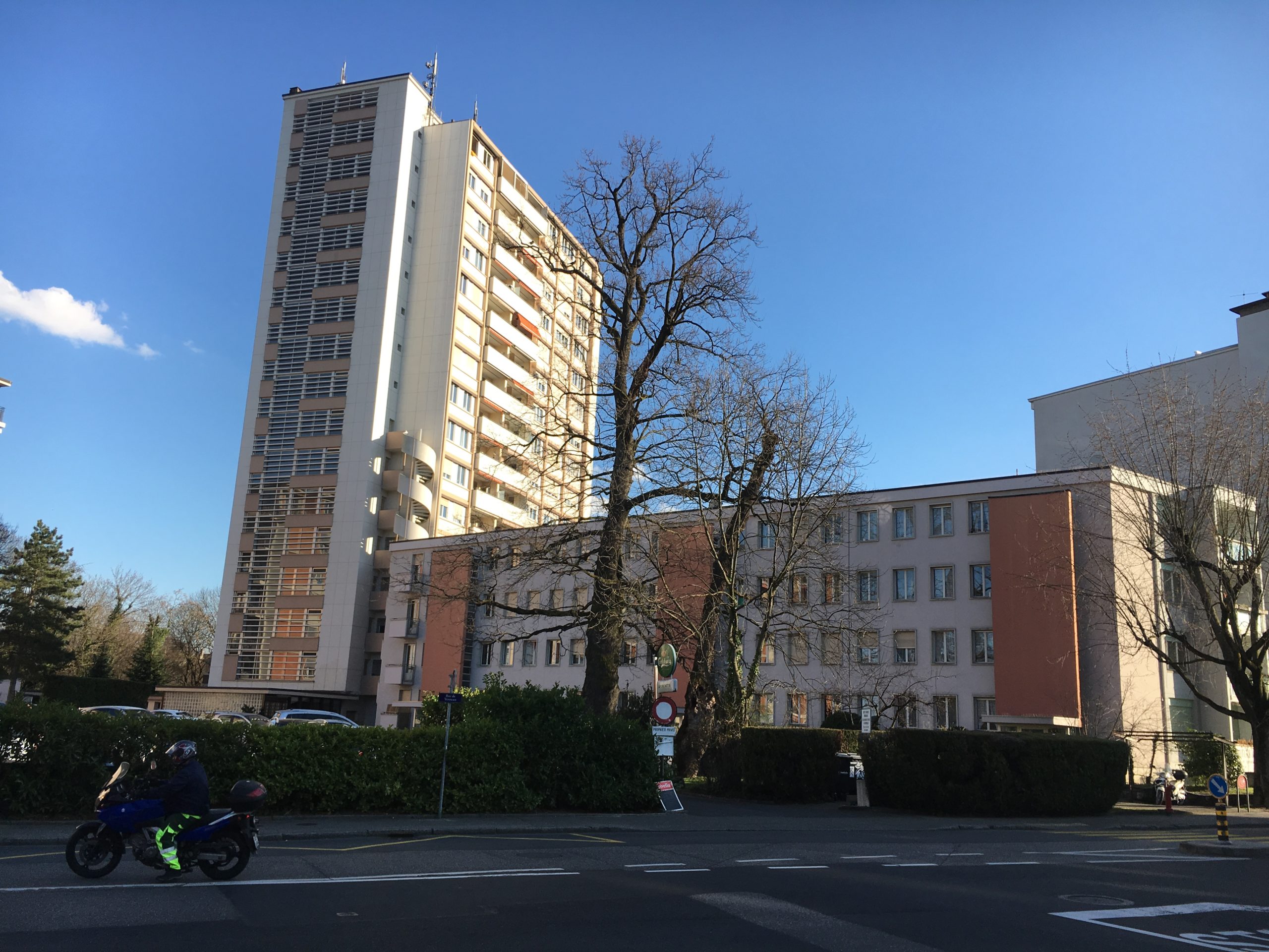Immeuble construit en 1957 par André Bordigoni et Jean Gros et Antoine de Saussure. Premier exemple genevois de « plan articulé autour d’un jardin », utilisé ensuite à Morillon-Parc et Le Lignon. Modèle issu des Beaux-Arts. Ensemmle de près de 1’000 logements, parc public au milieu. tour de Vermont, dernière étape du quartier d’hab. constr. sur l’anc. domaine de Vermont entre 1950 et 1957 par André Bordigoni, Jean Gros et Antoine de Saussure sur un plan d’Eugène Beaudouin[1][2][3][4]